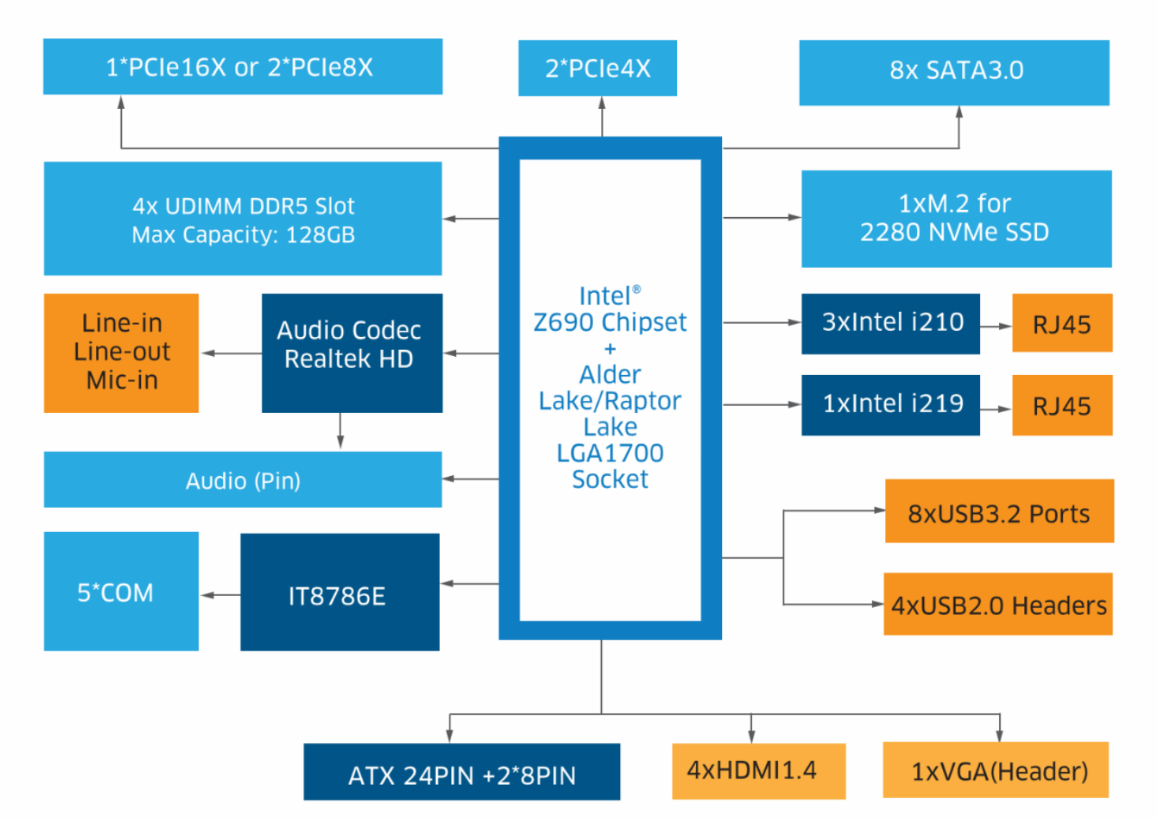 海量内存与快速存储:支持高达128GB的DDR5内存和丰富的存储选项,包括8个SATA端口和1个M.2 NVMe SSD插槽,确保高速数据传输和大量数据存储。